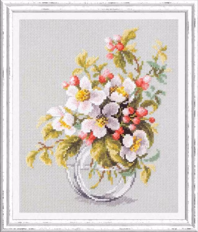Broderas med mouline Gamma i räknade kors- och efterstygn på grå aidaväv Zweigart, 5,5, rutor/cm. Motivmått ca 18 x 23 cm