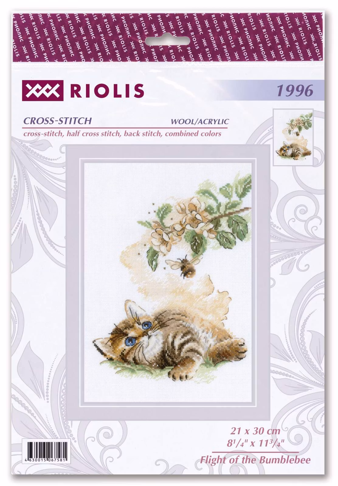 I broderikitet ingår mönster, ull/acrylgarn Safir 16 färger, aidaväv Zweigart count 14, en nål.
