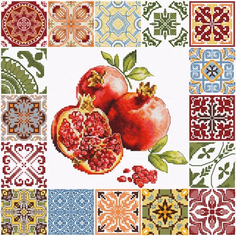 Broderas med mouline i räknade korsstygn- och efterstygn på vit aida väv 6,3 rutor/cm. Motivmått 25,5 x 25,5 cm