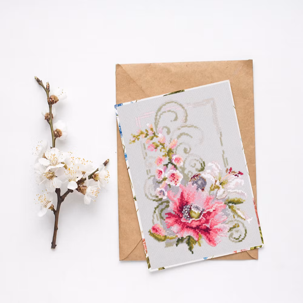 I broderikitet ingår mönster, mouline 20 färger, aidaväv 14 count, en nål.