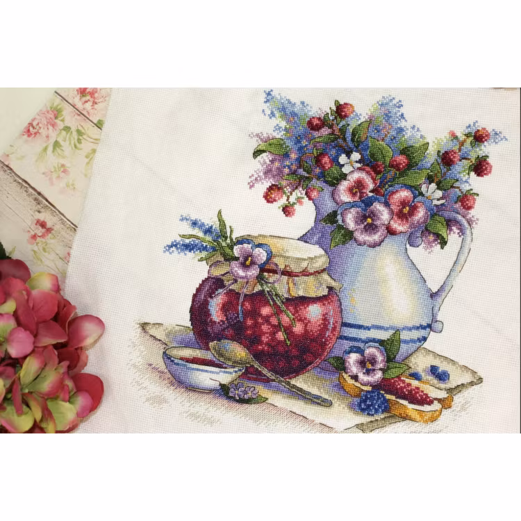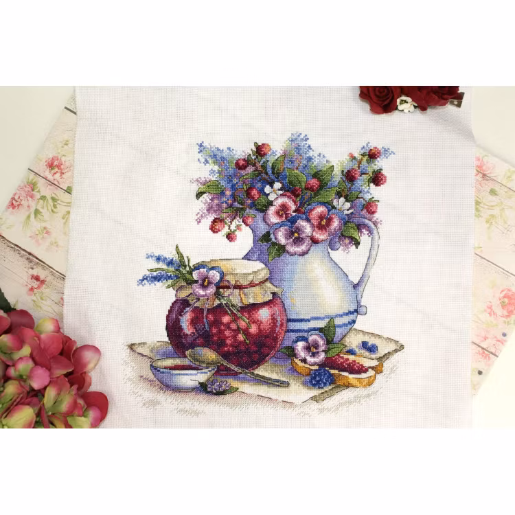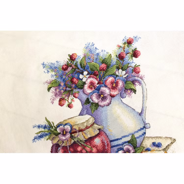 I broderikitet ingår mönster, mouline 32 färger, aidaväv 16 count, en nål.
